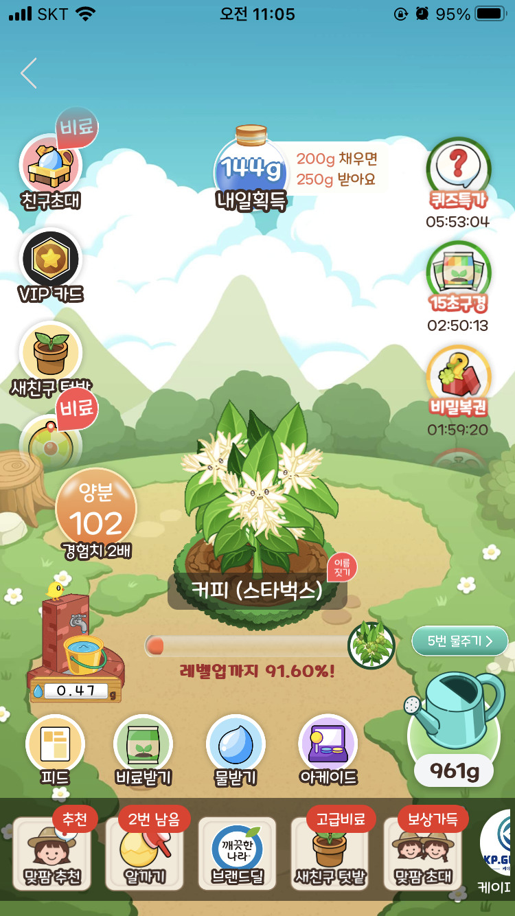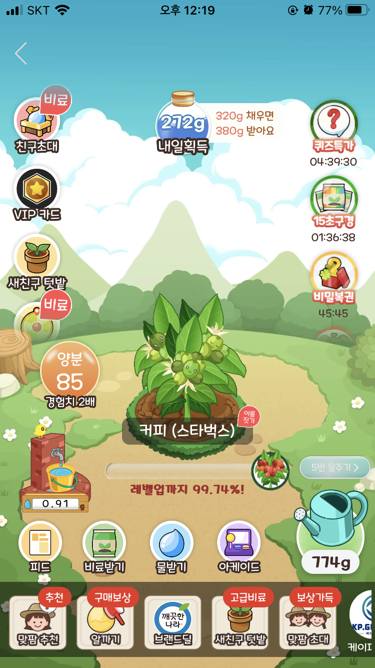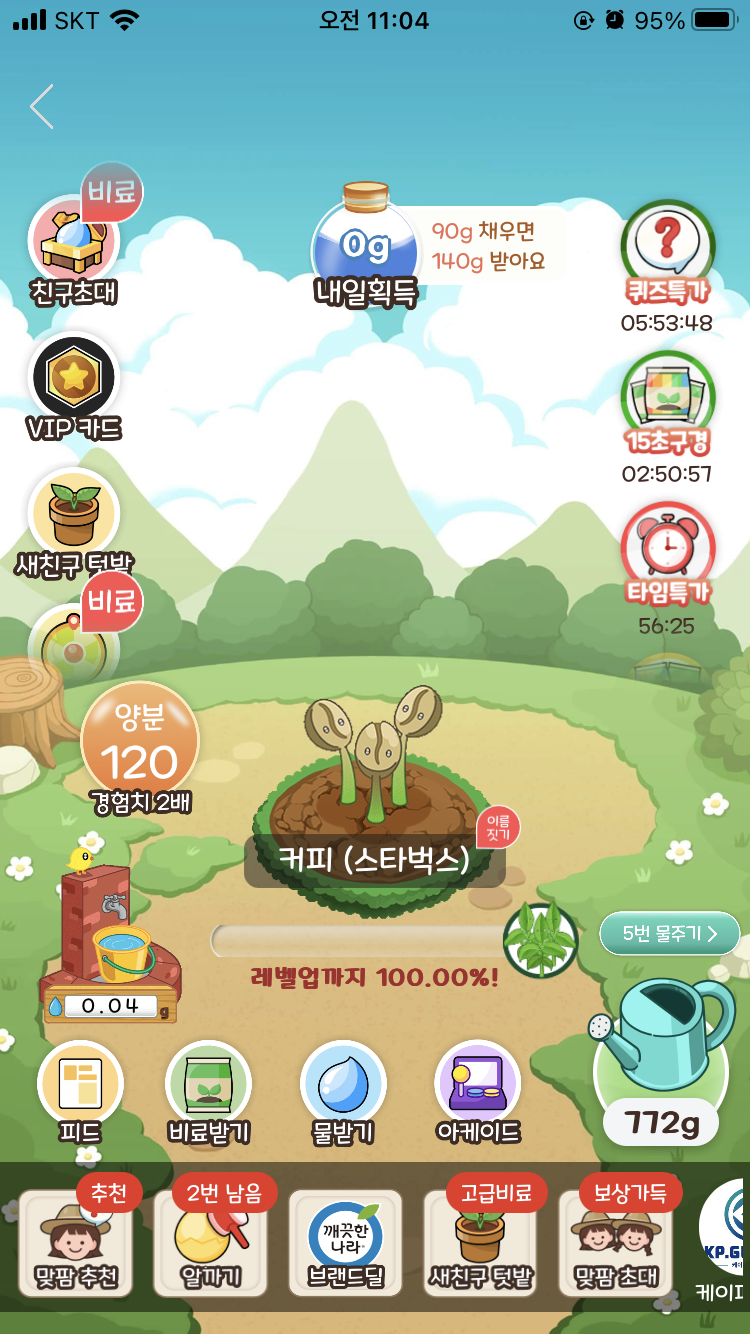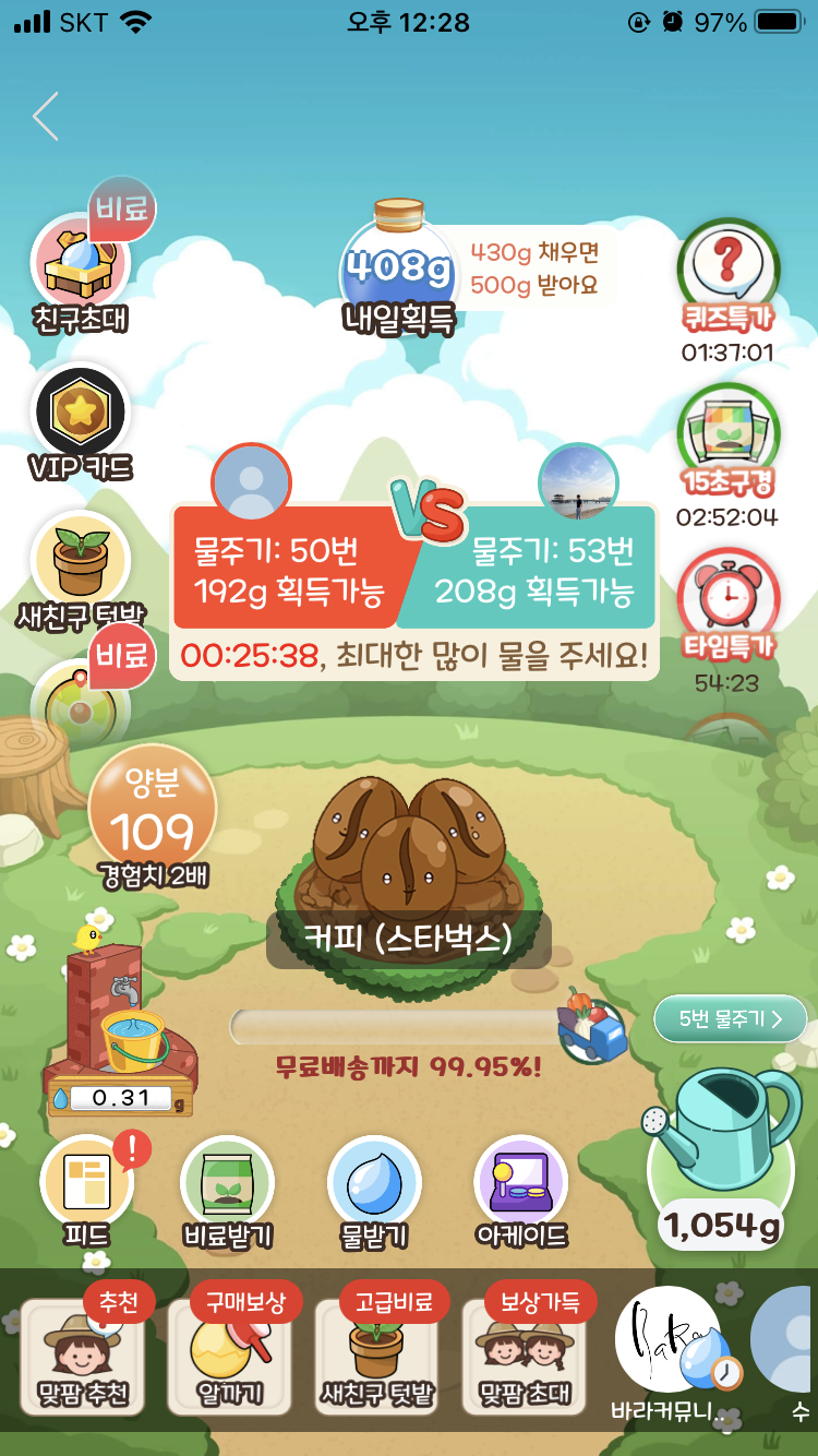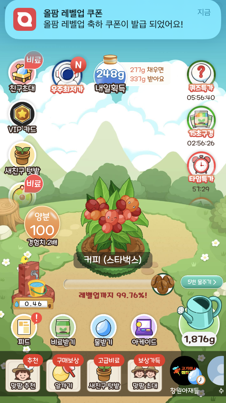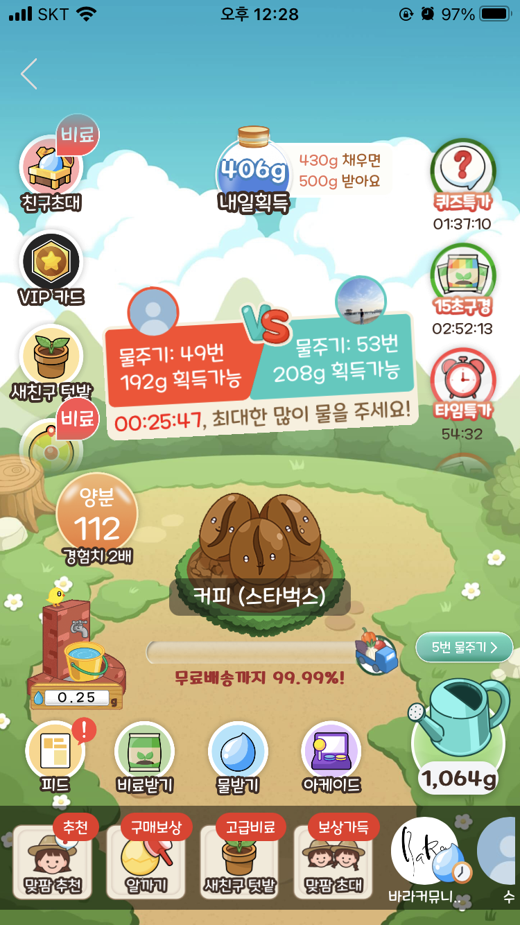 얘가 완성되면 작물이 다 성장한 것이기 때문에 레벨업까지가 아니라 '무료배송까지'라고 멘트가 바뀐 것을 알 수 있다.