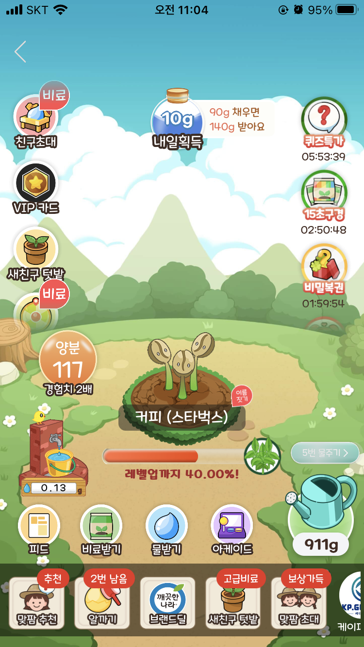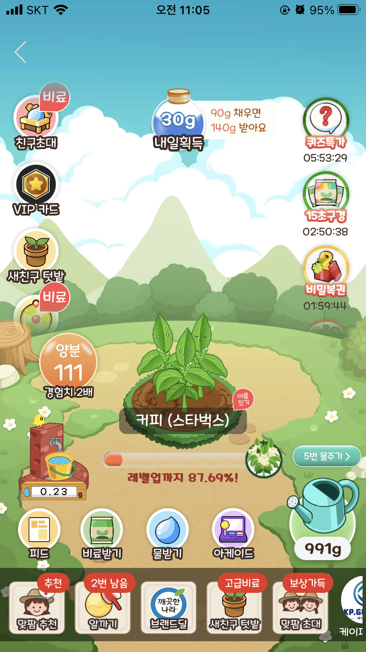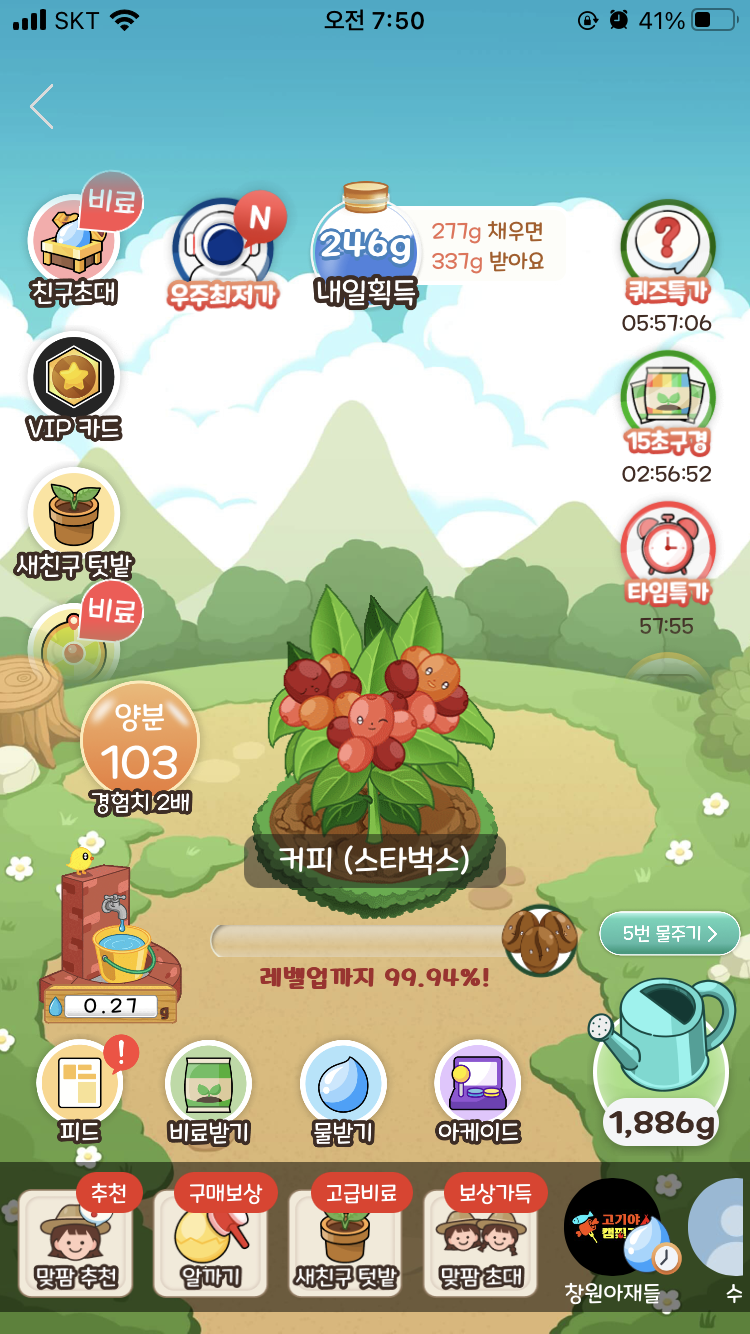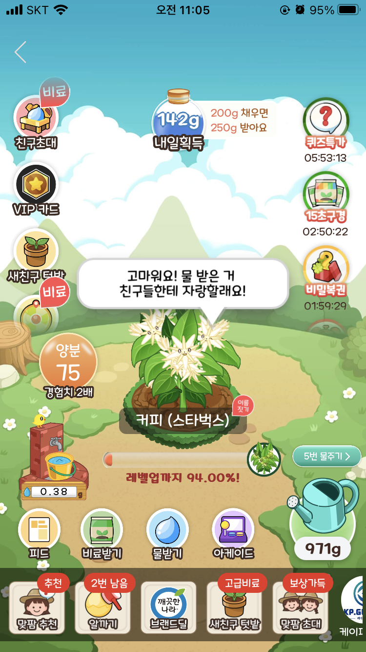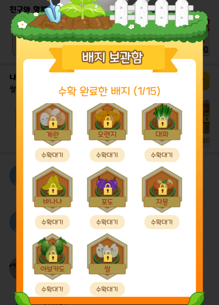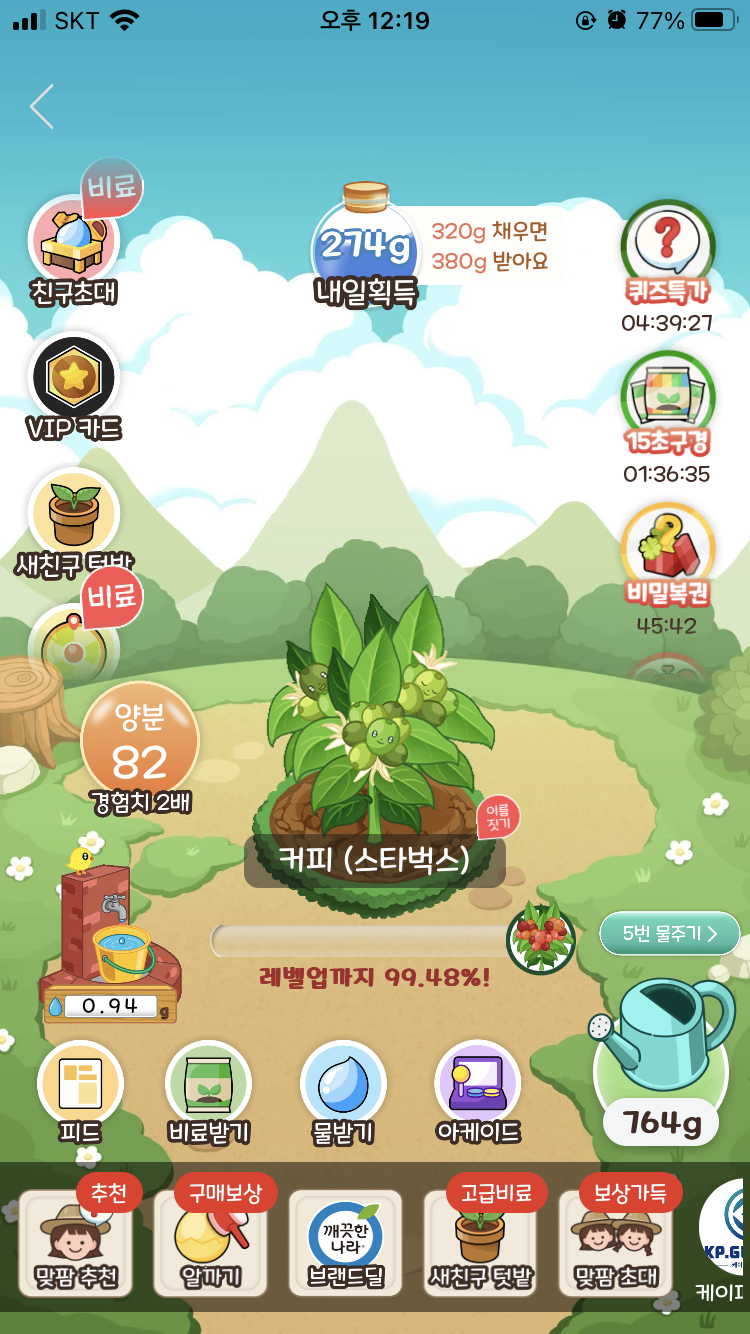 얘가 완성되면 작물이 다 성장한 것이기 때문에 레벨업까지가 아니라 '무료배송까지'라고 멘트가 바뀐 것을 알 수 있다.